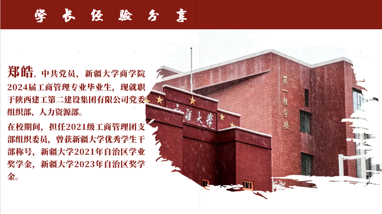 为帮助同学们明确学业规划、缓解就业压力,2025年10月31日,新疆大学商学院2024级工商管理2班成功举办“论文写作与就业准备”主题经验分享会。活动特邀2024届优秀毕业生郑皓(现就职于陕西建工第二建设集团有限公司党委组织部)担任主讲,班主任魏璐老师与田德海同学共同主持。