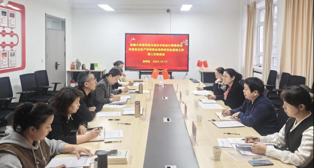 12月17日上午新疆大学商学院与信永中和会计师事务所产学研合作基地第二次推进会在商学院会议室顺利召开。会议旨在回顾总结前期合作成果,确定下一阶段合作的重点方向与目标。信永中和会计师事务所审计合伙人、乌鲁木齐分所主任会计师王凤华、审计一部经理李艳萍、审计高级经理魏月梅、行政管理部经理彭梅,学院院长易红梅、党委副书记雷珩、副院长宋凌峰、学位办主任陈娜、培养办主任张力、综合办主任黄瑞参加座谈。