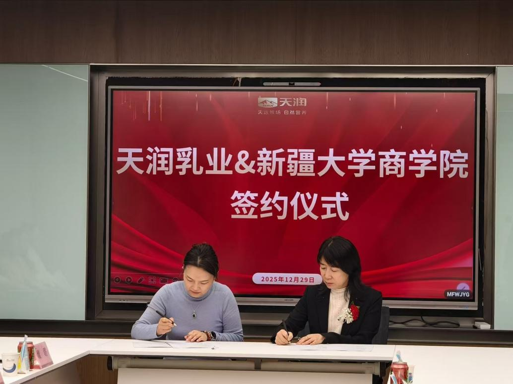 在商学院师生与天润乳业管理层的共同见证下,双方正式签署《产教融合研究生联合培养基地合作协议》。易红梅院长强调,此次签约是继今年8月学院赴天润乳业实地调研后的又一深化合作的落地举措。双方在前期充分沟通的基础上,立足商学院专业建设与人才培养需求,共建校外实习实训基地,聚焦人才培养方案共研、实习岗位定制化开发、产学研科研项目联合攻关三大核心方向深化合作。